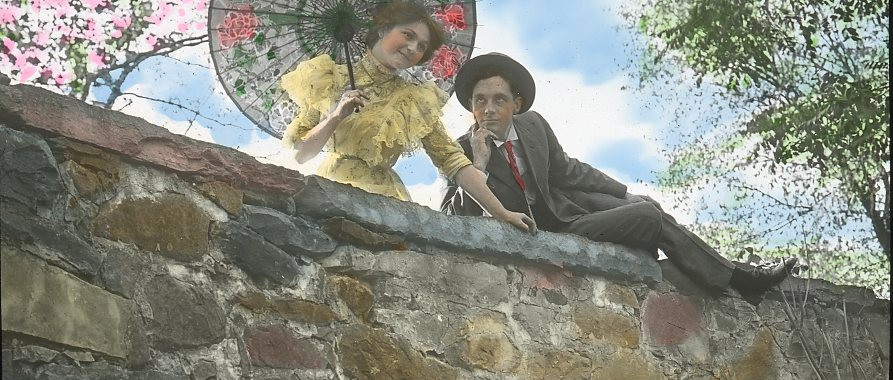 In the mid to late 1800s these magic lanterns became very popular in the United States. On the east coast companies like C.W. Briggs, Eastman-Kodak, and the Keystone View Company produced lantern slides for sale. Slides were also imported from European companies, with special interest taken in slides that offered views from around the world or from important events. Slides were black and white, but as their popularity grew the want for colored and moving images became more apparent. Black and white slides were painted by hand and became the most popular images for sale. Most homemade slides were still black and white. In the 1930s the Kodak company released transparency film that was the clearest colored process for photograph development, and these slides quickly became the top seller. Slides that had multiple pieces could be used to show movement on screen. By moving one slide on top of another, it looked like a character was moving across the screen, or that the sun was rising in the sky. These slides were more expensive but were used by companies to show moving cartoons and children’s stories. Individual photographic slides were replaced by film strips, and then film reels. Being able to minimize the transitional “click” between the film pieces was the mark of a professional magic lantern user. Magic lanterns were the pivotal middle piece between mere photo projections and the movies that we see today.